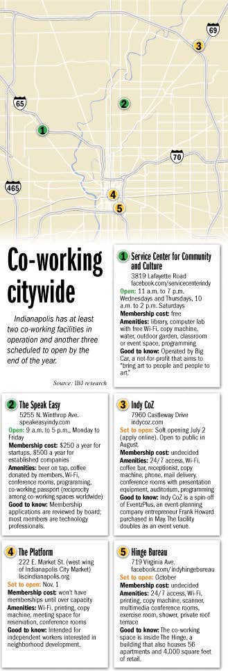 Indianapolis already is home to two such facilities, and three more are slated to open by the end of the year. Most of them have membership fees, and some cater to a certain field. The details might differ, but the concept clearly is catching on as technology changes the traditional workplace dynamic.